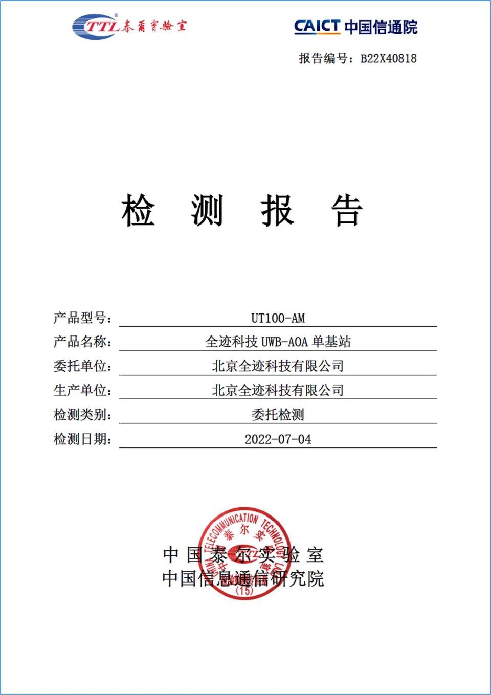 近日,中國信息通信研究院/中國泰爾實驗室完成了UWB-AOA單基站定位解決方案檢測驗證項目。本次相關(guān)檢測業(yè)務由中國泰爾實驗室下泰爾系統(tǒng)實驗室獨立承擔完成,為北京全跡科技有限公司基于型號為UT100-AM的UWB-AoA單基站解決方案執(zhí)行了嚴格的檢測并驗證了其定位能力。